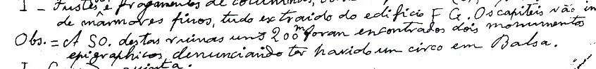 “A SO destas ruínas [a sala com pavimento de mosaico sobre hipocausto] uns [sic] 200 m foram encontrados dois monumentos epigráficos denunciando ter havido um circo em Balsa”.